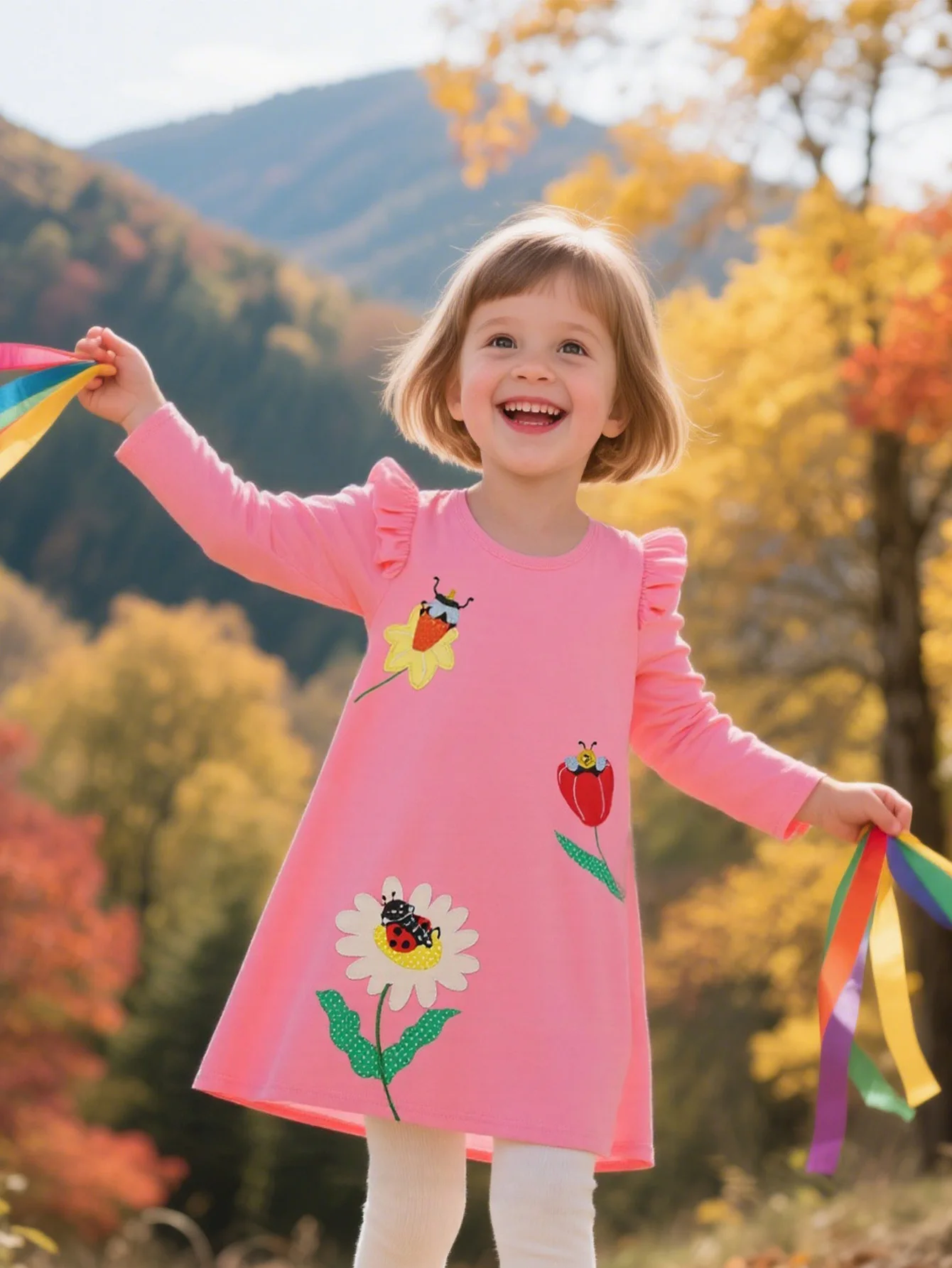 Toddler Girl's Pink Floral & Bug Print Dress with Ruffle Sleeves, Cute Fall Casual Outfit  Read more
