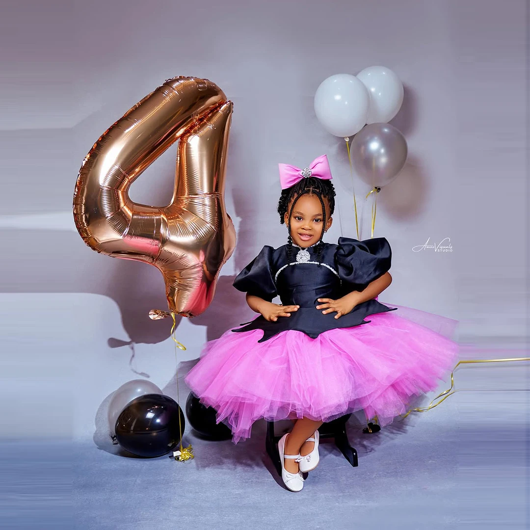 Africa South Style Puffy Ruffled Tulle Dresses For Girls Black Pink A-line Satin And Mesh Patchwork Dress Kids Birthday Dress