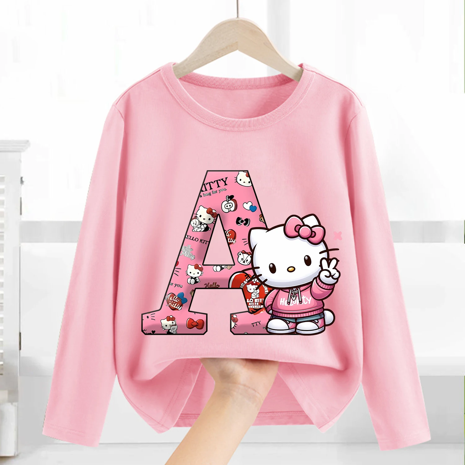 Hello Kitty Long Sleeve for Children Letter A-Z Cartoon Clothing Pink Casual Caftan Fashion Girls Clothes Round Neck Blouse Gift