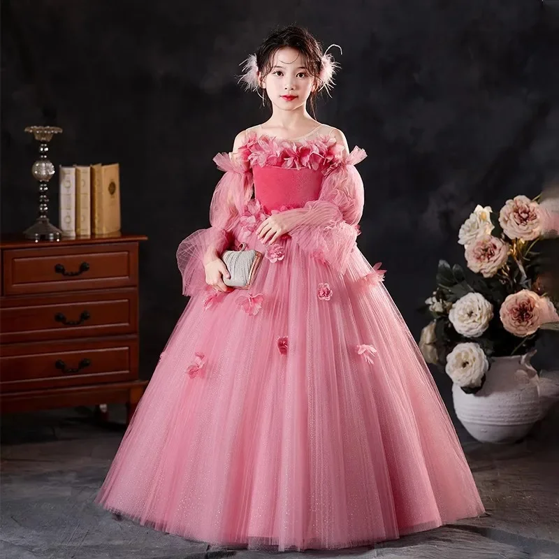 2025 Pink Princess Dress Birthday Party Gown Elegant Long Sleeve Tulle Girl Wedding Formal Attire Dresses for Girls Piano Flower