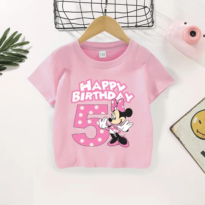 Minnie Mouse Happy Birthday T Shirt for Girl Pink Number Baby Tees Cute Cartoon Cotton Short Sleeve Toddler Tops Kids Party Gift
