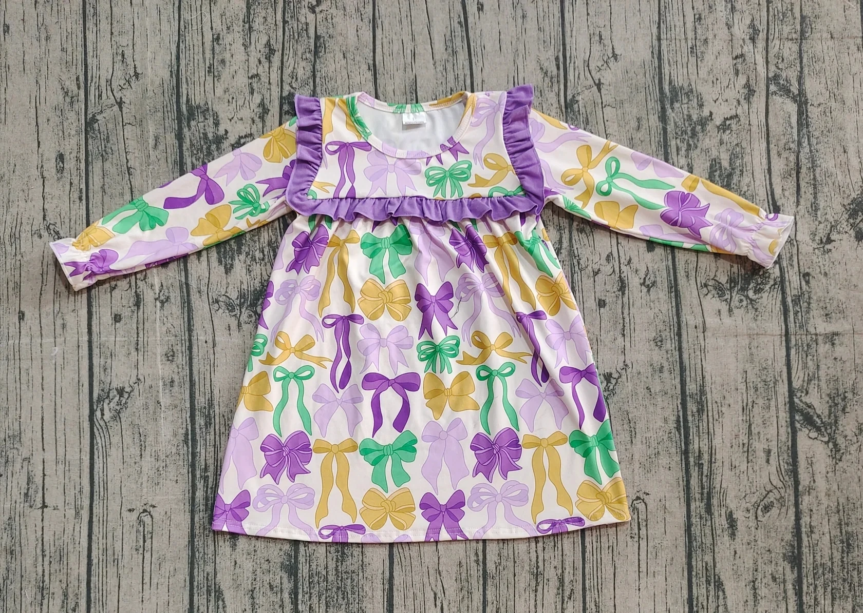 Wholesale Baby Girl Long Sleeves Mardi Gras Purple Ruffle Infant Toddler Girls Bows Dress Kids Children Knee Length Clothing