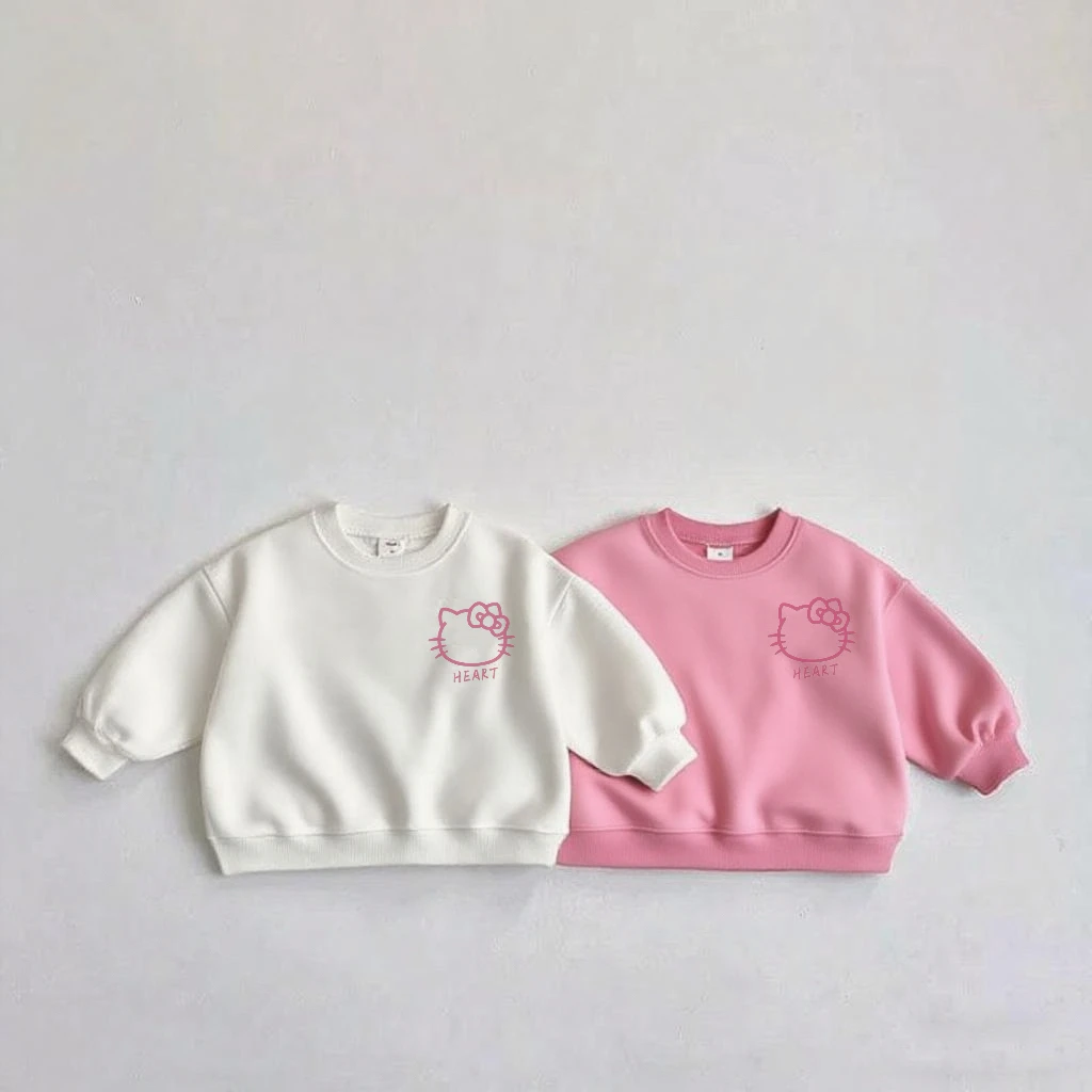 Pink White Tops For Girls Cartoon Cat Printed Loose Casual Clothing Crewneck Tops Children New Design Cute Hoodies Outer Wear