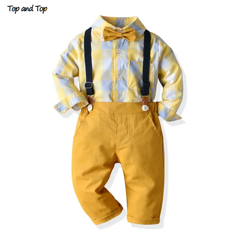 Top and Top Kids Boys Gentleman Clothing Set Cotton Long Sleeve Plaid Shirt with Bow Tie + Overalls Boys Formal Wear for Wedding