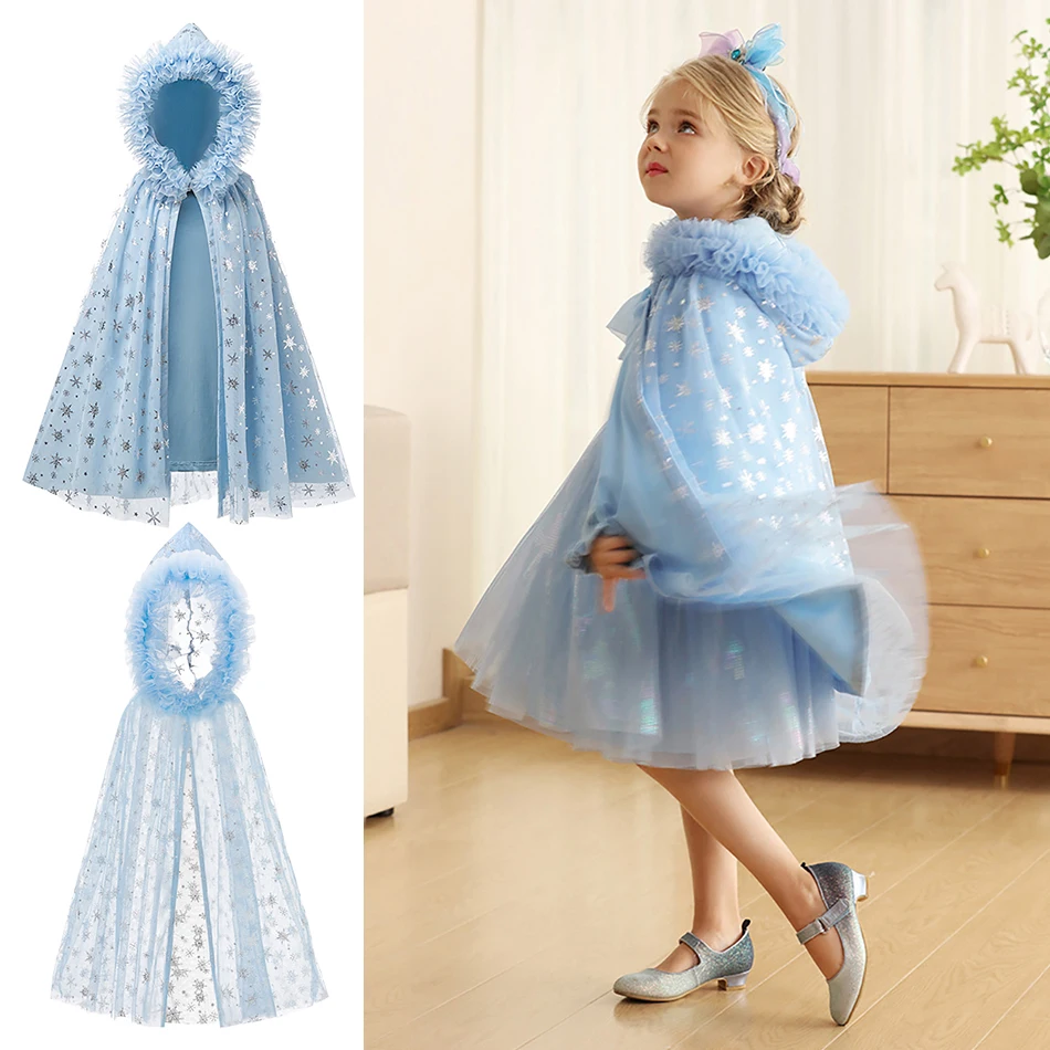 Girls Hooded Cape Cloak Children Princess Dress Snowflake Print Windproof Shawl Coat Kids Elsa Spring Autumn Outerwear Clothes