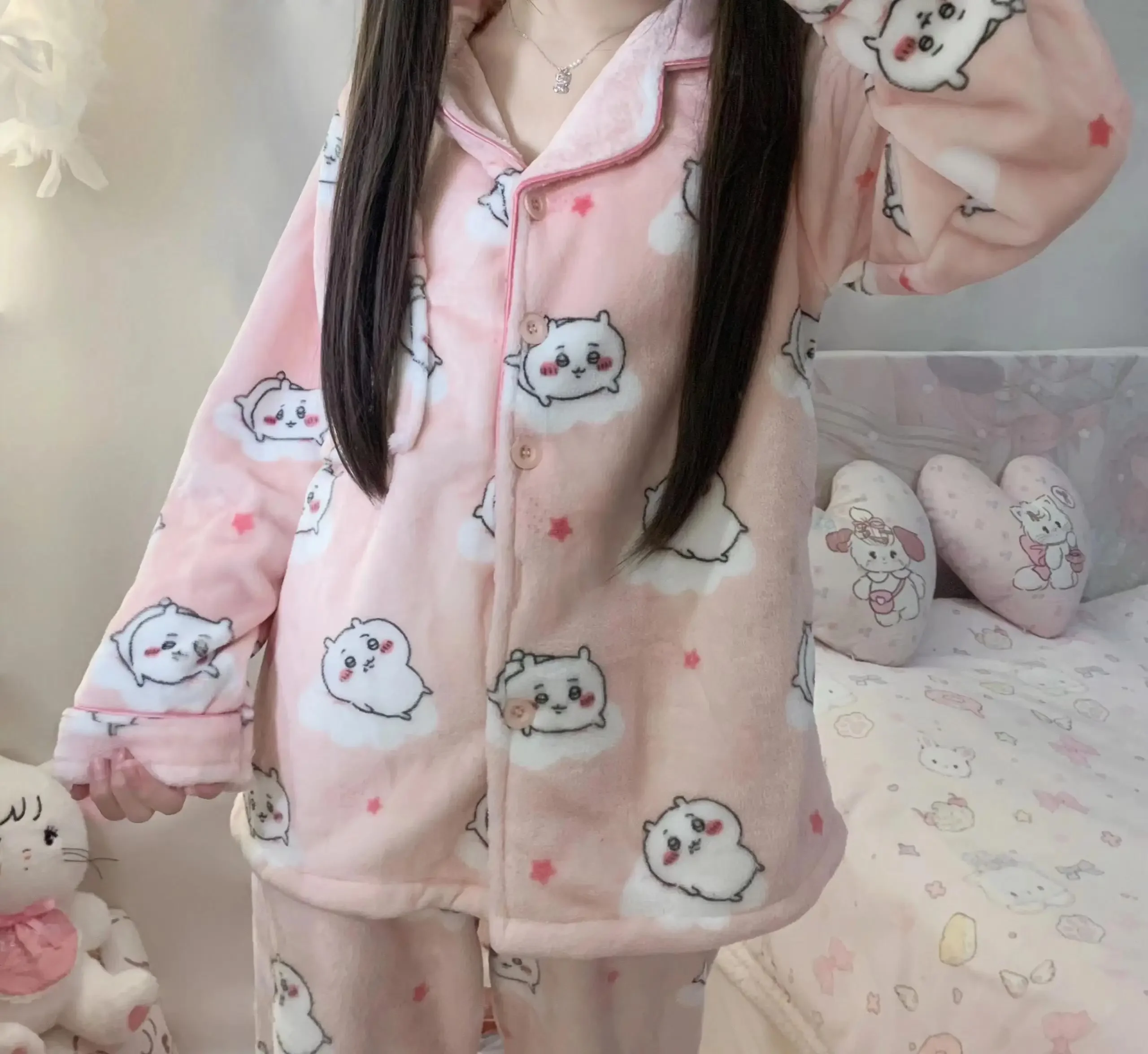 Cartoon Chiikawa Pajamas Girls Winter Coral Velvet Plus Velvet Thickened and Warm Usagi Hachiware Cute Pajamas Home Clothes Set