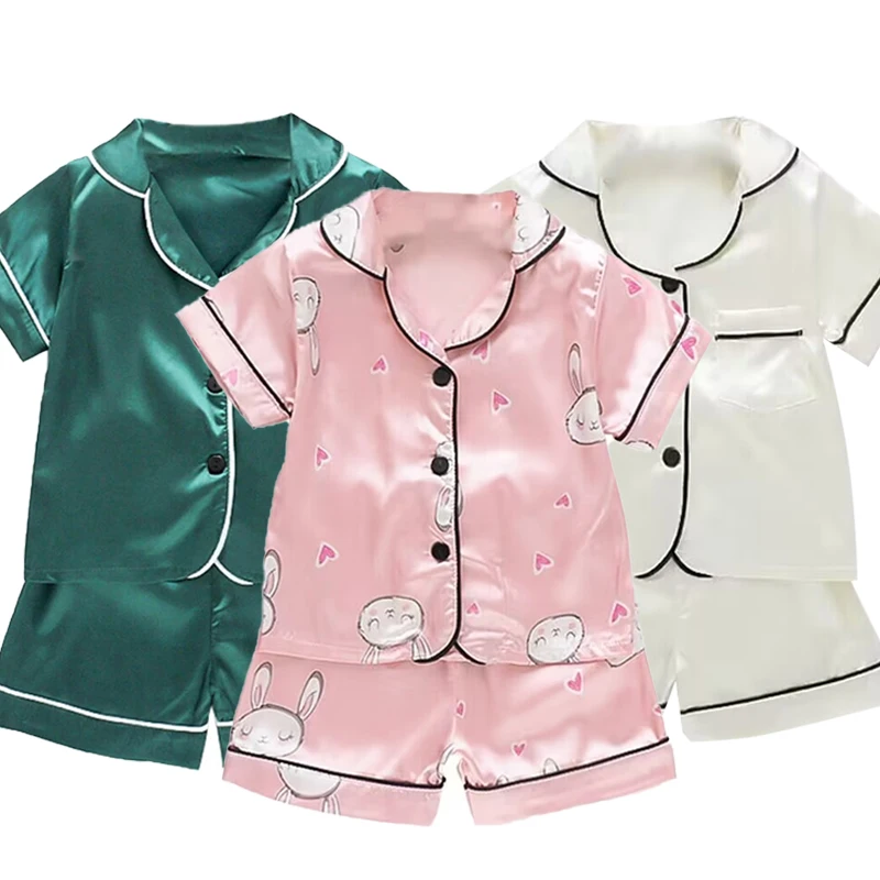 Summer Short Sleeve Satin Pajamas Silk Fabric Girls Sleepwear Boys Nightwear Solid Children's Pajama Sets Pyjamas Boy Baby Wear  Read more