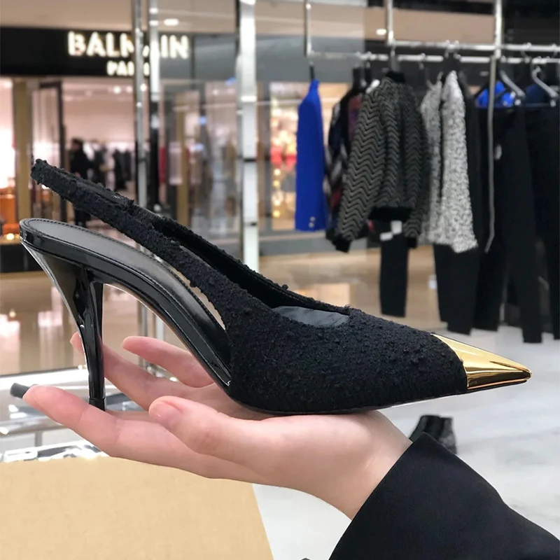 Metallic Pointed-toe Black High Heels 2024 Summer New Sexy Pumps with Stiletto Heels Back Tripper Toe Toe Sandals