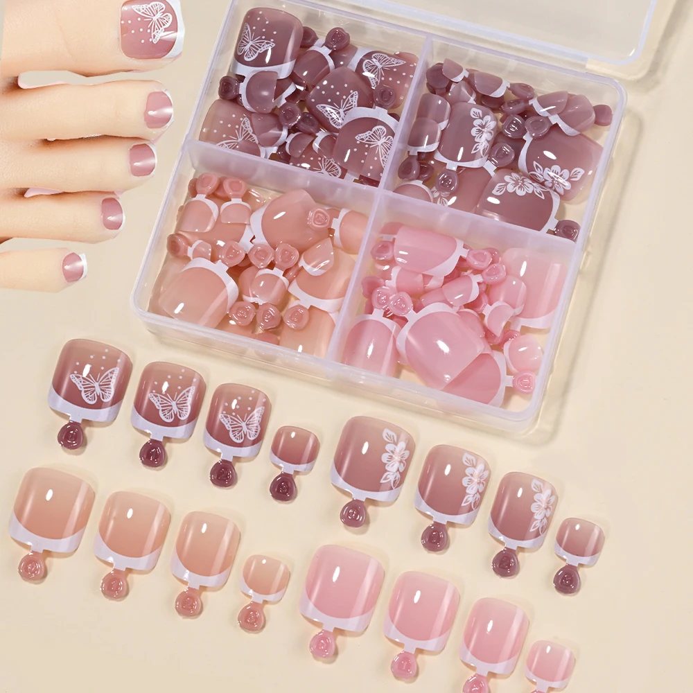 120/100Pcs French White Edge False Toe Nails Acrylic Short Square Full Cover Fake Toenails Summer Wearable Press on Toenails