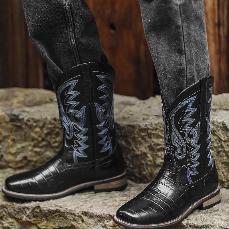 Men Boots Embroidered Mid-calf Boots Retro Western Cowboy Boots Outdoor PU Leather Boot Designed Slip on Men Shoes Plus Size 48