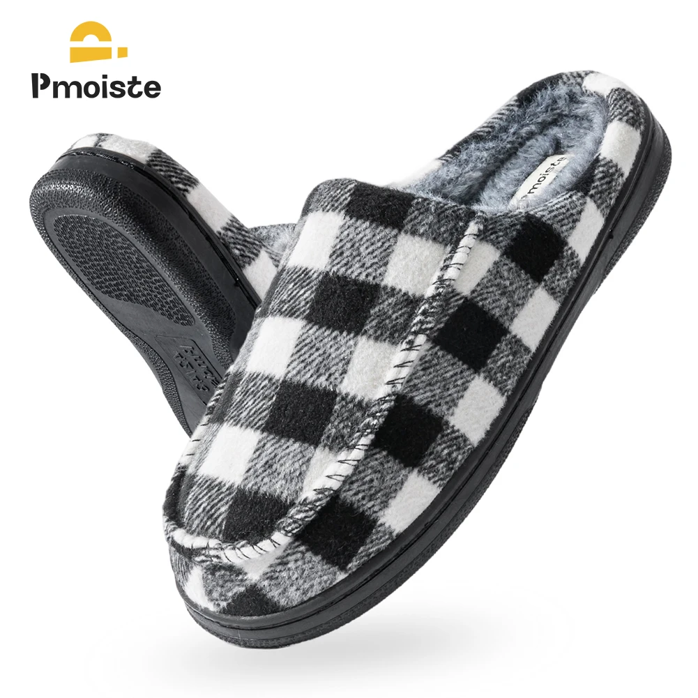 Pmoiste Woolen Plaid House Shoes Men Comfortable Soft Warm TPR Cushion Memory Foam Living Room Slippers Slip On Winter Indoor
