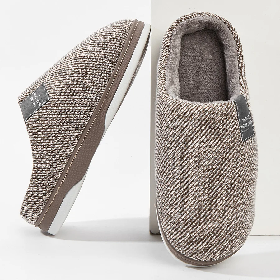 Pmoiste Soft Flannel House Slippers Men Strip Upper Designer Warm Cushion Memory Foam Living Room Shoes Slip-on Winter Indoor