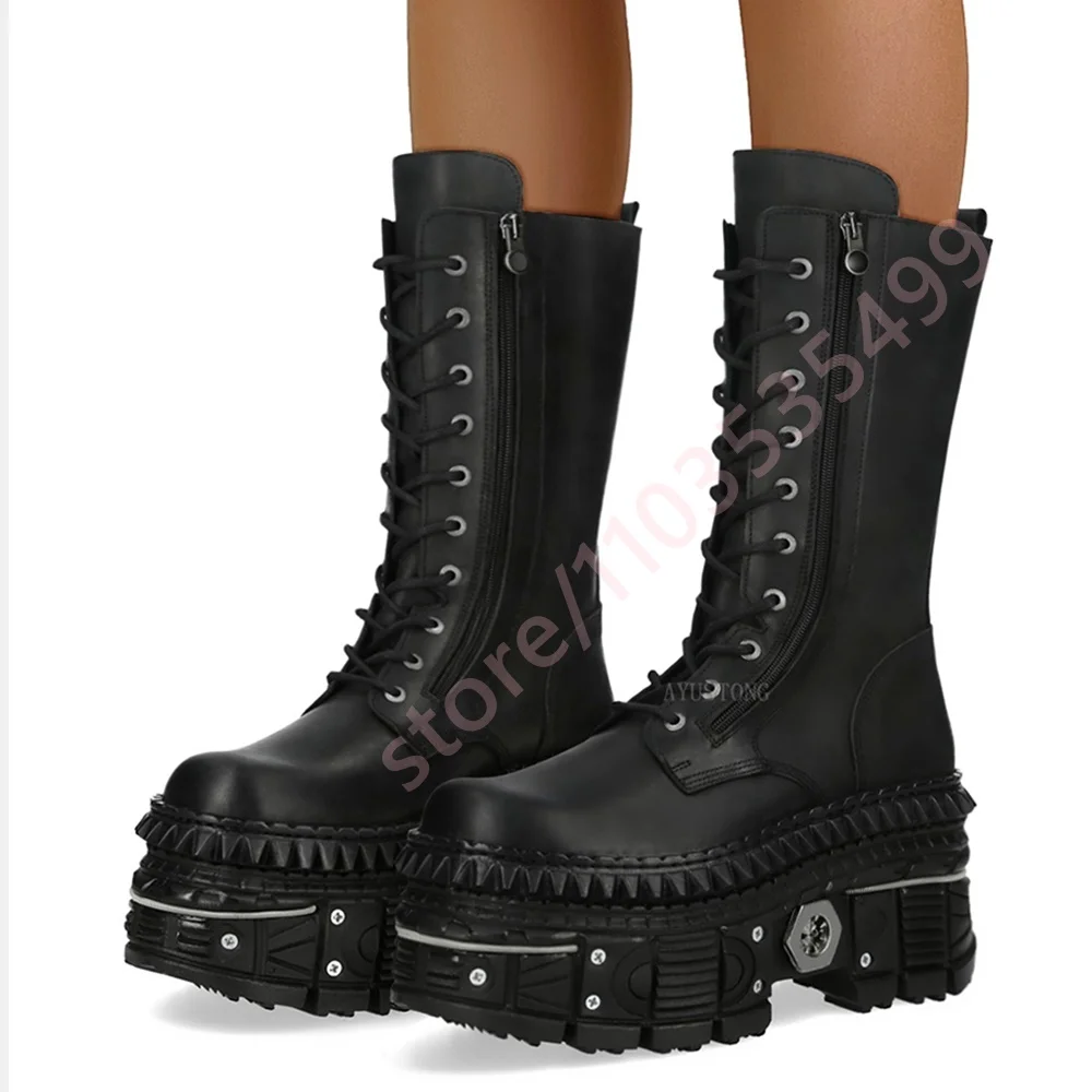 Punk Rivet Lace-Up Motorcycle Boots Thick Sole Round 2025 Autumn New Street Rock Mid-Calf Boot Fashion Sports Casual Zipper Boot