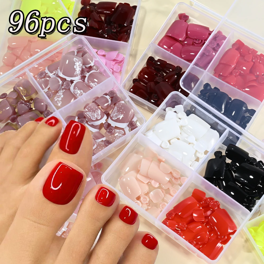 96Pcs Short Square French Tip Press on Toenails Pink/Red/Black Full Cover Fake Toe Nails Wearable Feet Extension False ToeNails