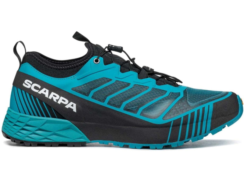 DEMO Scarpa Ribelle Run Shoes - Men's Azure/Black 43 33071/351-AzrBlk-43. The upper is mesh and welded PU that is reinforced with a translucent ripstop for extra abrasion resistance. A climbing inspired full-perimeter TPU rand provides more...  Read more