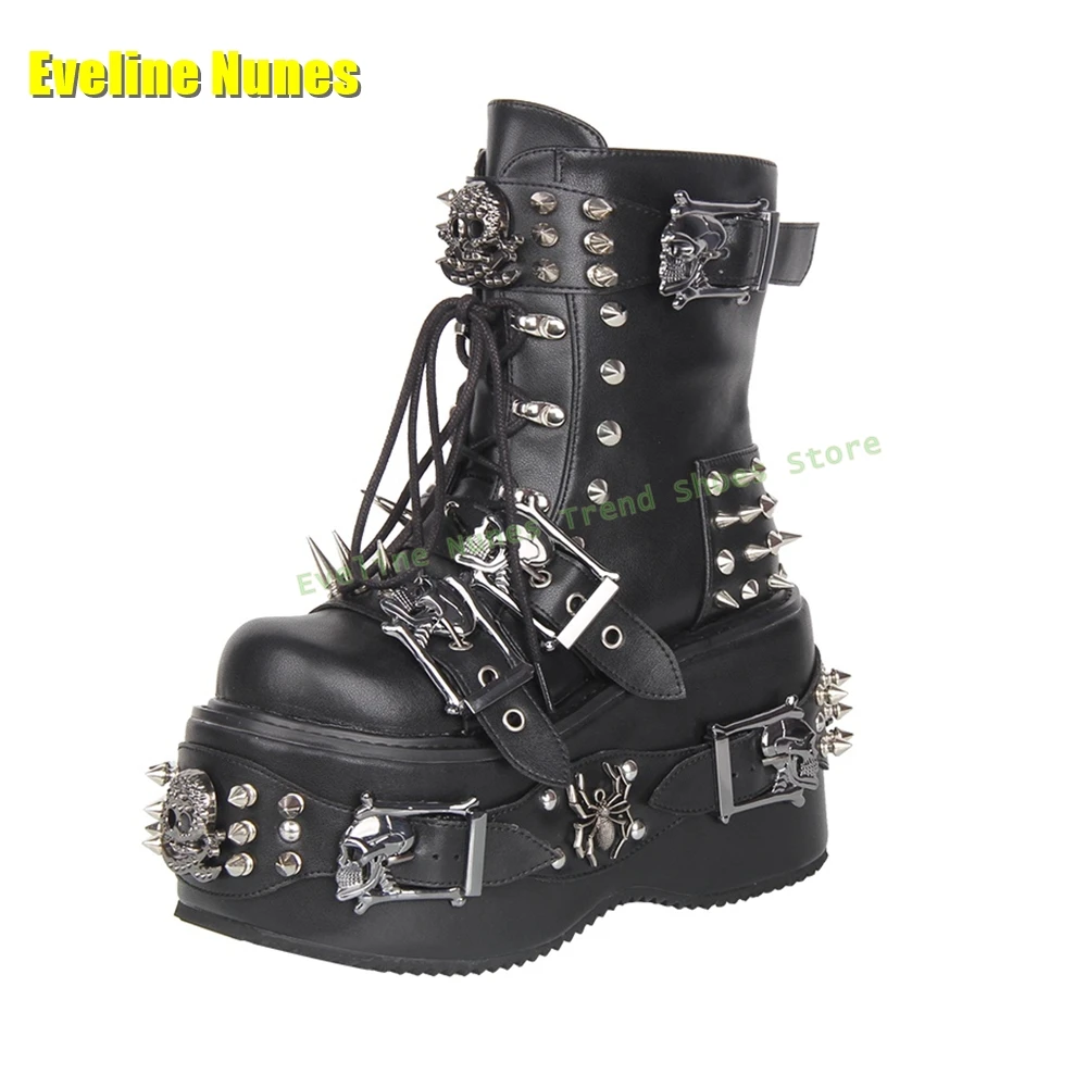 Black Punk Rivet Platform Boots Round Toe Tank Sole Belt Buckle Metal Spike Skeleton Decoration Dark Motorcycle Boots 2025 Trend