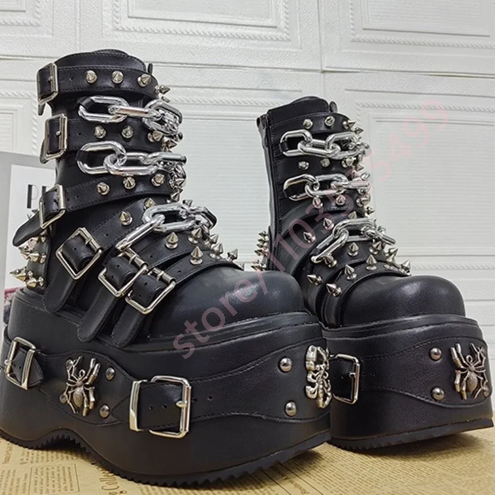 2025 Punk Thick Sole Rivet Chain Motorcycle Boots Street Rock Round Belt Buckle Fashion Casual Boots Party Wedge Heel Ankle Boot