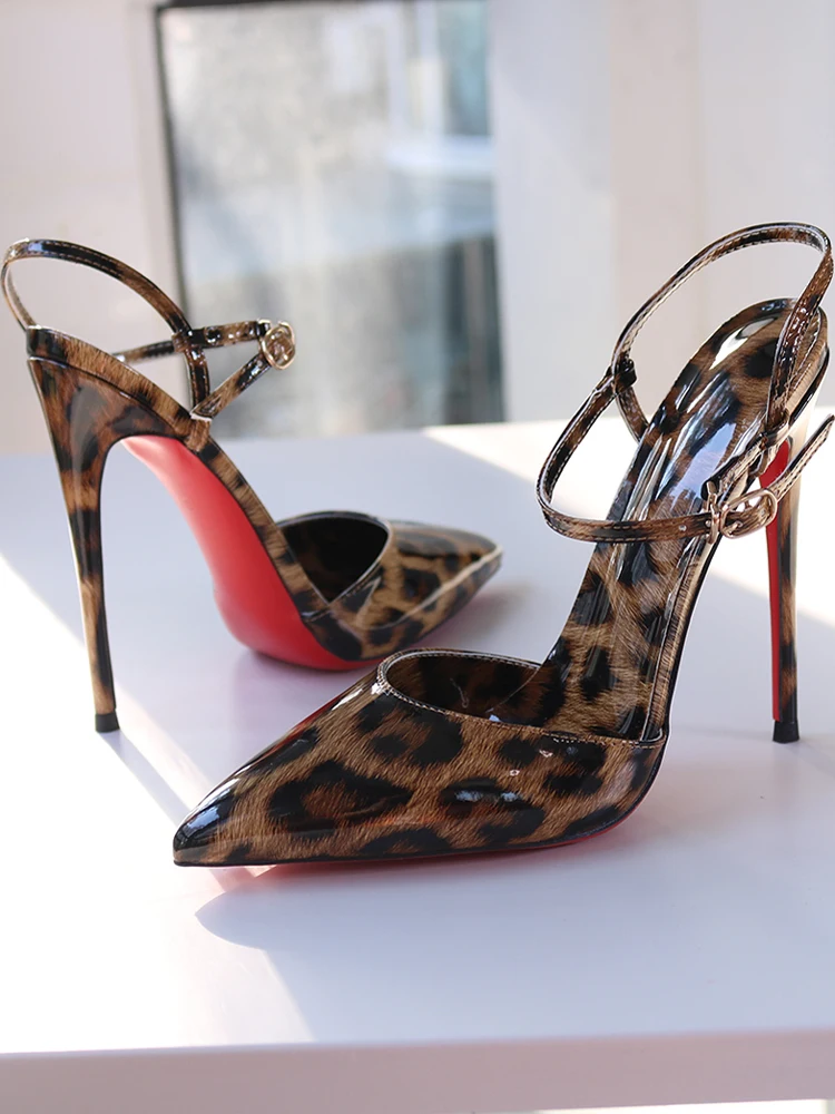 Red background leopard print high-heeled sandals with a straight buckle thin heel pointed toe fashionable and sexy big size 12CM
