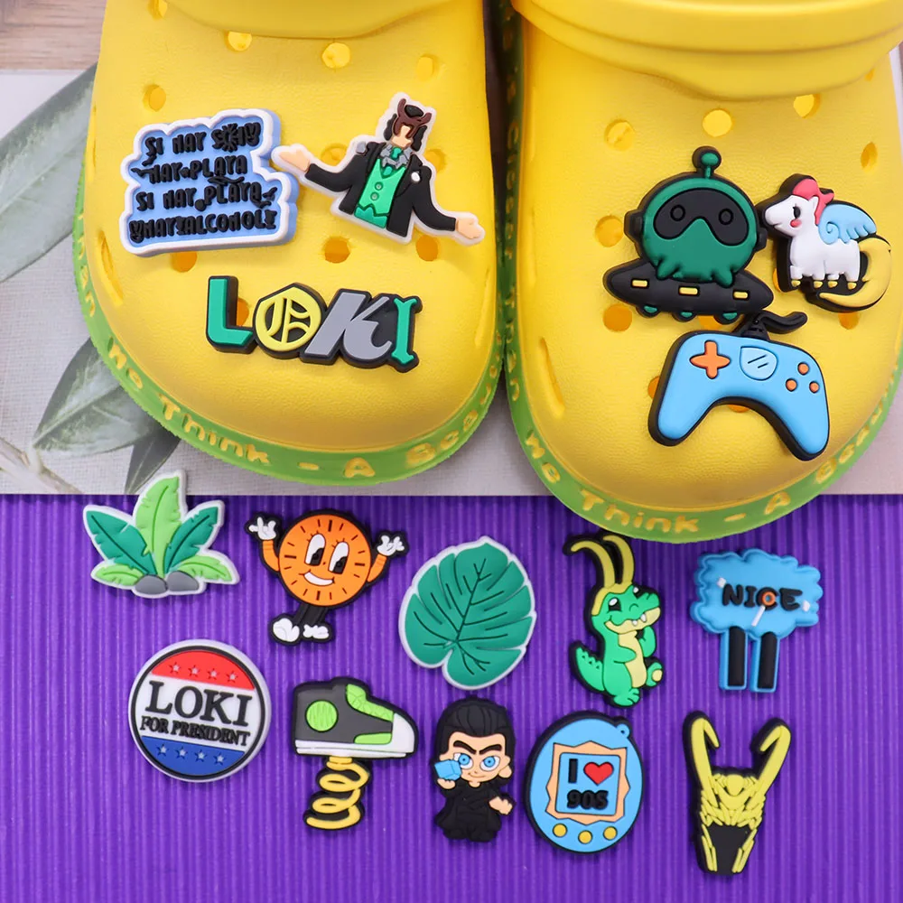 16Pcs UFO Leaf Nice Loki PVC Shoes Charms Accessories I Love 90s Movie Character Sandals Buckle Fit Kids Birthday Gifts