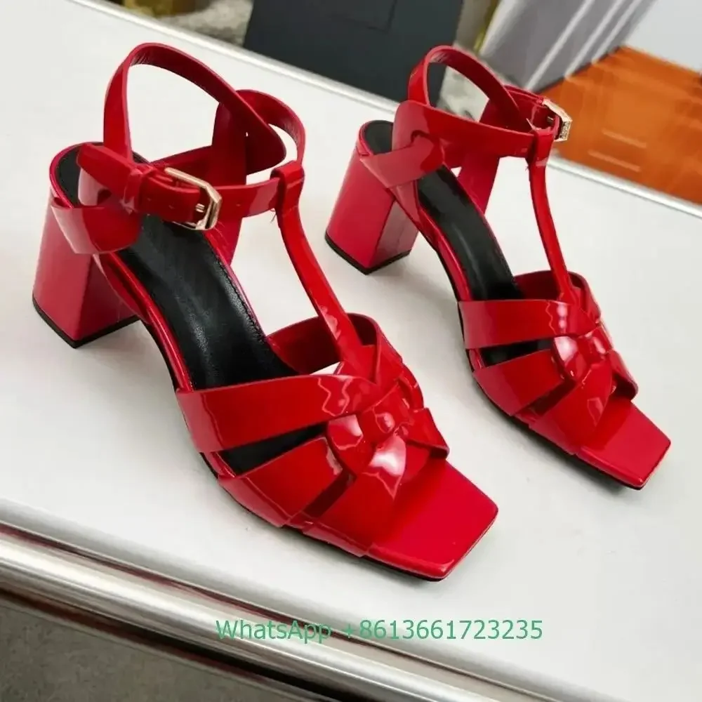 Cross Straps Square Toe Chunky Heel Sandals Solid Color Open Toe Real Patent Leather 6.5Cm Heels 2025 Newest Summer Sandals