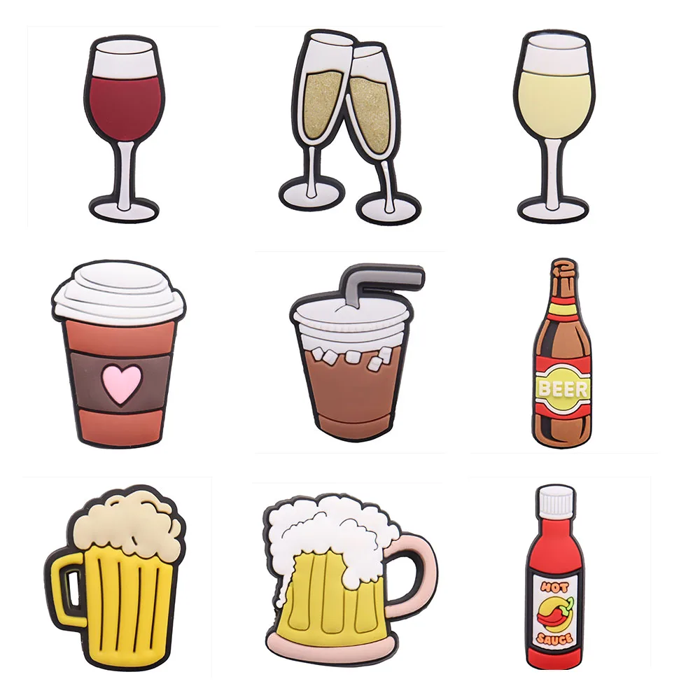 Single Sale 1pcs PVC Drinks Wine Beer Shoe Charms Sandals Shoes Decoration Fit Wristbands Hole Slipper Accessories Adult Gift