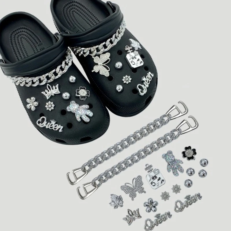20PCS Fashion Shoe Charms Set Accessories Hole Shoe Buckle Silver Rhinestone Letter Bow Chain DIY Shoes Decorations for Bogg Bag