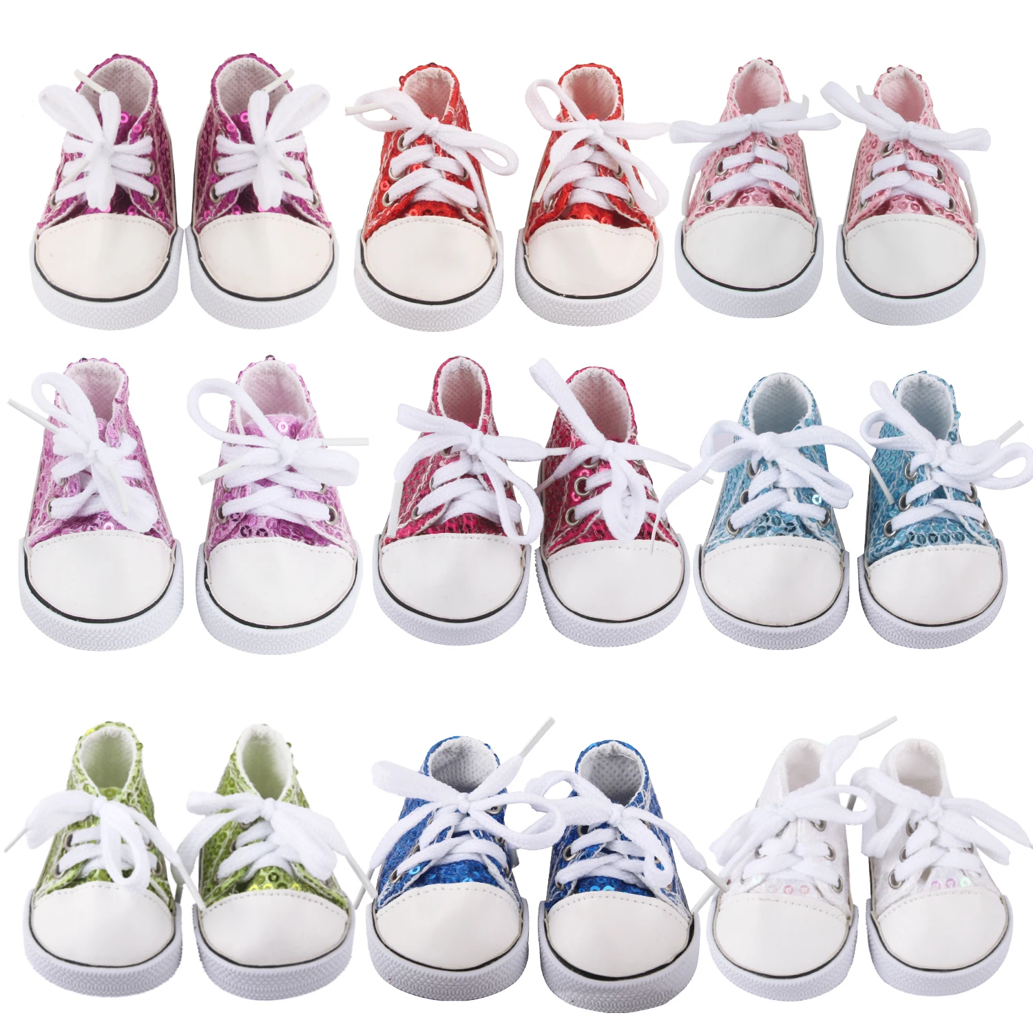 New 7CM Canvas Sequins Doll Shoes For 18 inch American Dolls Shoes Lace-up Sneakers For 43cm Baby New Norn&OG, DIY Girl Doll Toy