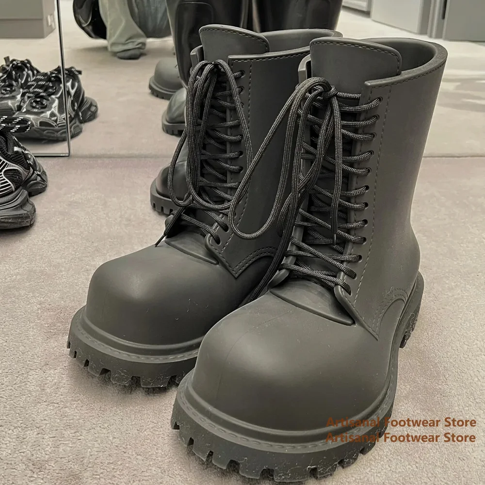 Black Leather Motorcycle Men's Boots Round Toe Height Increasing Lace Up Work Boots British Style Designer Men Shoes Botas Mujer