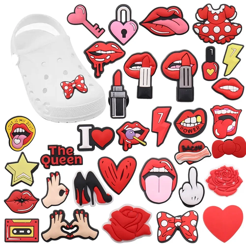 Hot Sale 1pcs Shoe Charms Red Lip Heart Rose Lightning Love PVC Accessories Garden Shoes Buckle Decorations Fit Kids X-max Gift