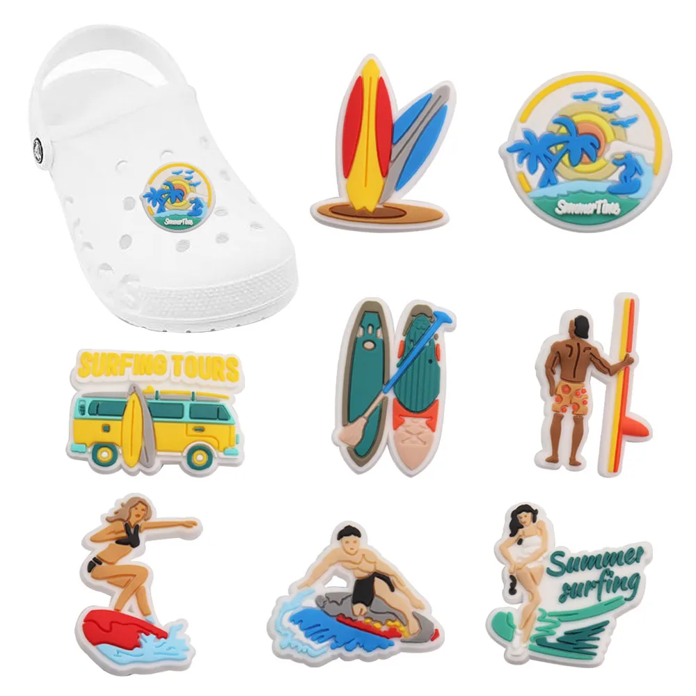 Single Sale 1-9pcs Shoe Charms Surfing Surfboard Sea Swimming Accessories PVC Shoes Decoration DIY For Wristbands Party Gift