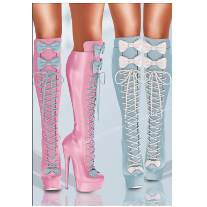 Green Lace Up Platform Bow Knot Boots Thin High Heel Sexy Fashionable Cool Winter Casual Big Size Woman Shoes Zapatillas Mujer