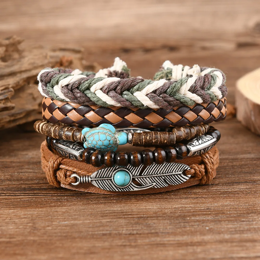 Bohemian Turquoise Wood Beaded Beaded Bracelet Leaf Flower Feather Multi-layer Men's Woven Leather Bracelet