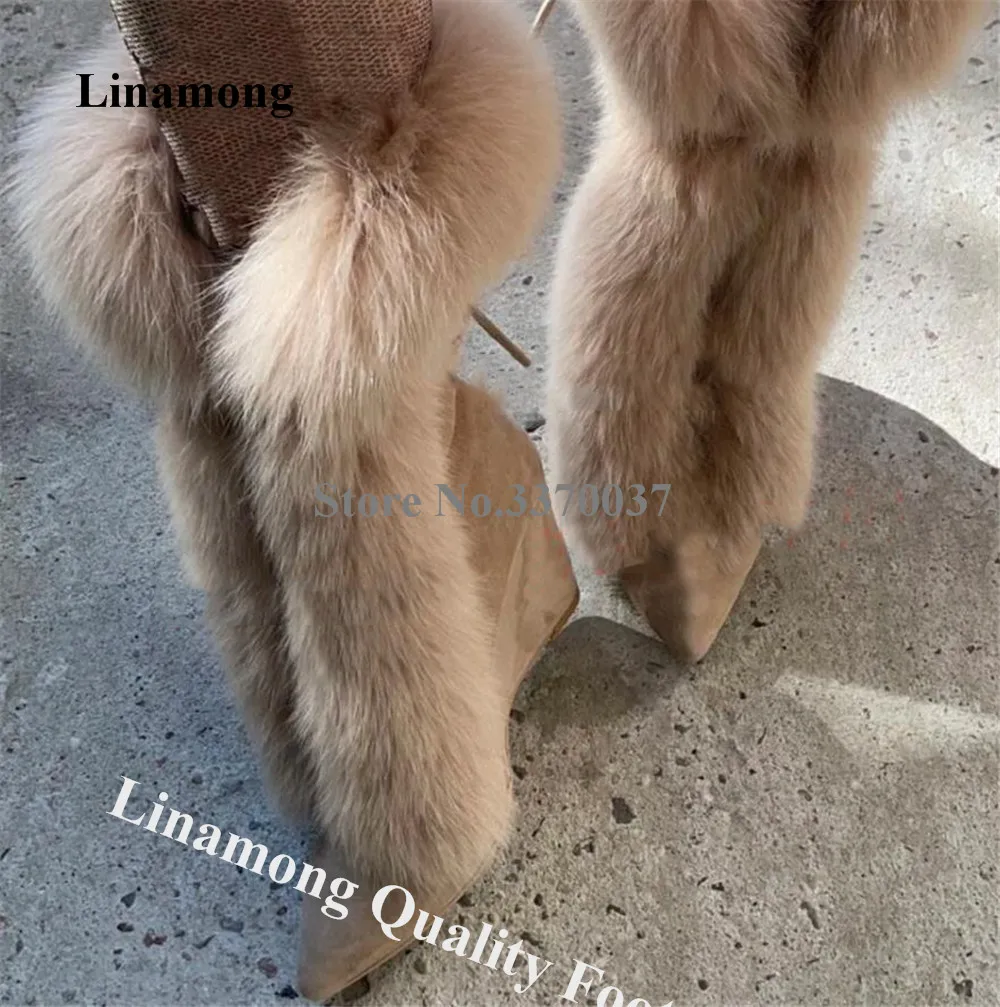 Linamong Newest Fur Fringes Mid-calf Wedge Boots Winter Sexy Pointed Toe Beige White Lace-up Warm Wedges Luxurious Boots