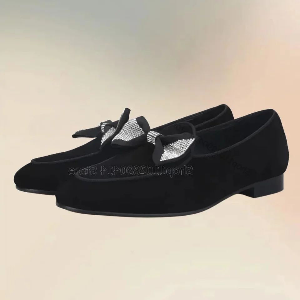 Crystal Bow Knot Decor Black Flock Loafers Fashion Slip On Men Shoes Luxurious Handcraft Party Banquet Office Men Casual Shoes