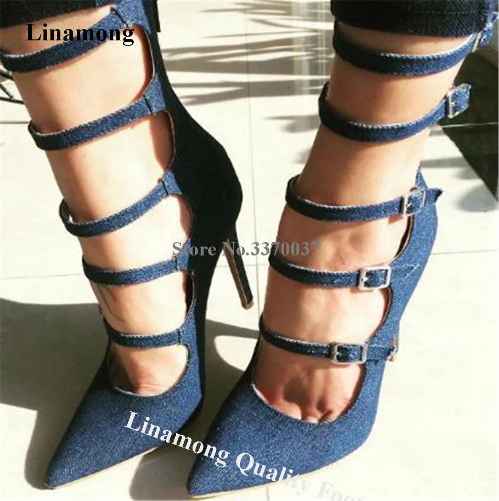Linamong Newest Spring Pumps Sexy Pointed Toe Blue Denim Nude Patent Leather Straps Cross Stiletto Heel Dress Shoes Party Heels