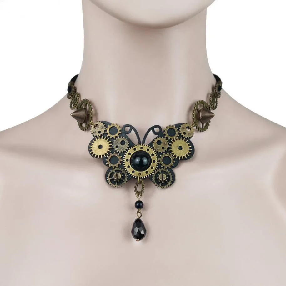 Vintage Punk Style Small Bronze Gears Covered Butterfly Steampunk Choker Necklace