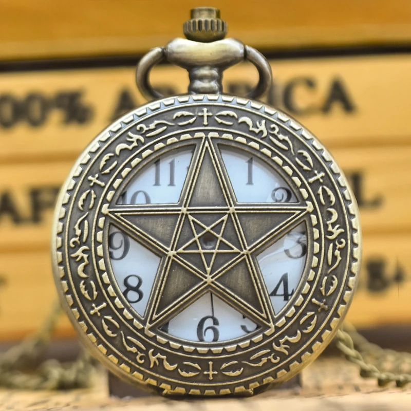 Vintage Bronze Clamshell Pentagram Hollow Carving Male And Female Students Gift Quartz Necklace Pocket Watch