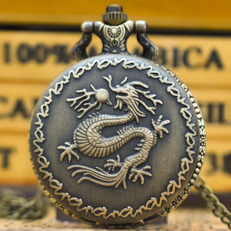 Vintage Bronze Clamshell Chinese Dragon Carved Necklace Quartz Pocket Watch Gifts Are Common For Male And Female Students