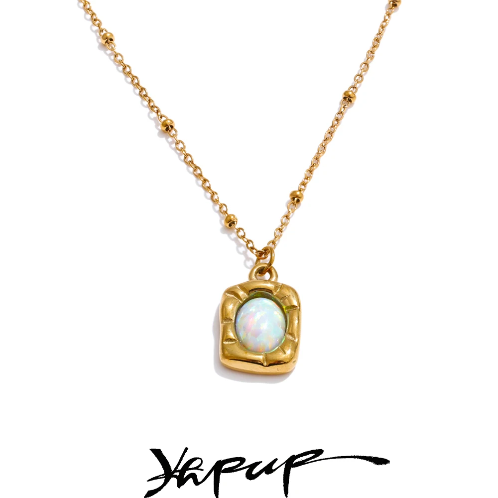 Yhpup High-Grade Imitation Australian Opal Stone Rectangle Pendant Necklace 316L Stainless Steel Arrivals Collar Jewelry