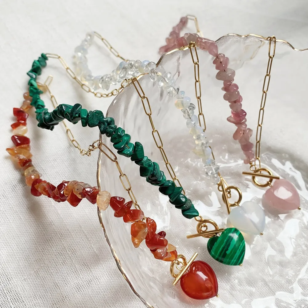 Stainless Steel Natural Stone Choker Necklace Heart Pendant Irregular Chips Gravel Pink Quartz Opal Red Agate Crystal Necklace