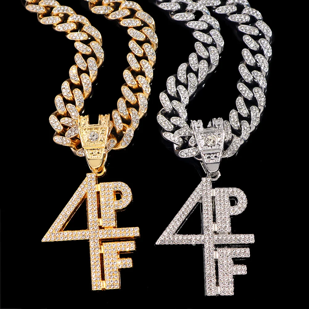 Hip Hop Iced Out Crystal Cuban Chain 4PF Letter Pendant Necklace For Women Bling Zircon Tennis Chain Necklace Men Punk Jewelry  Read more