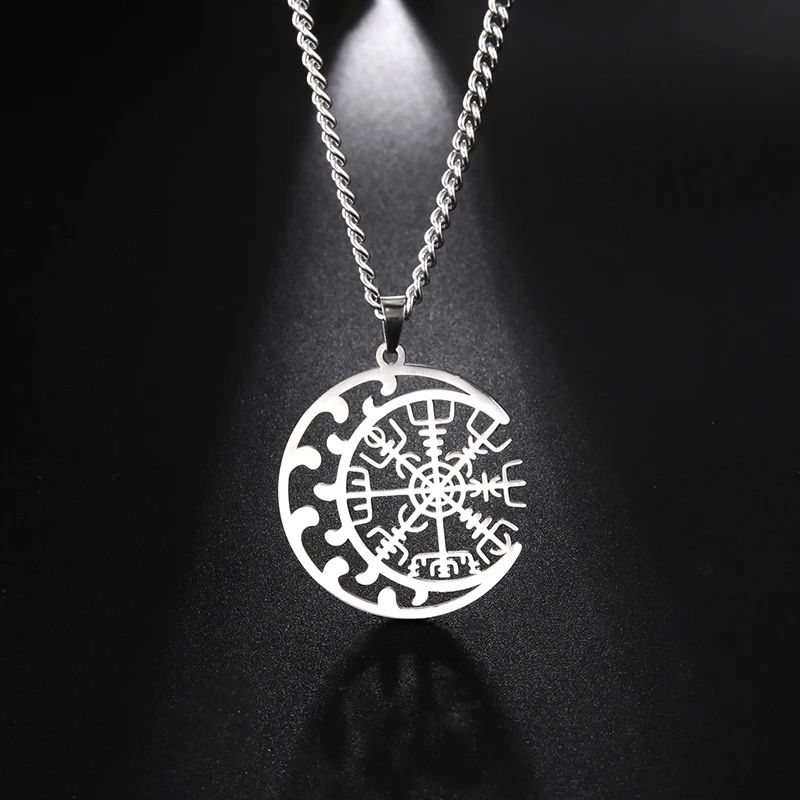 Vegvisir Stainless Steel Compass Necklaces for Men Norse Runes Amulet Helm of Awe Pendant Supernatural Moon Jewelry  Read more
