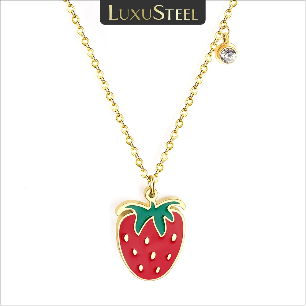 LUXUSTEEL Cute Crystal Strawberry Pendant Necklace for Women Girls Stainless Steel Waterproof Sweet Choker Birthday Gifts
