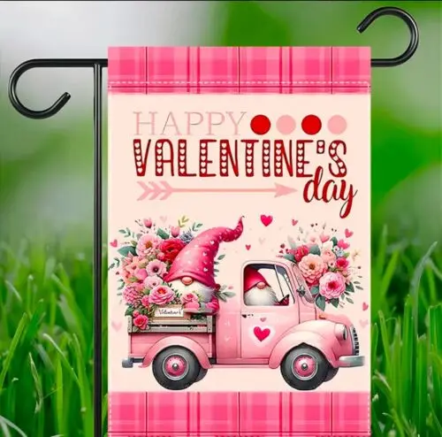 Garden Flag, valentine, pink gnome truck, 12” x 18”, thick burlap, double-sided HJN ZZU