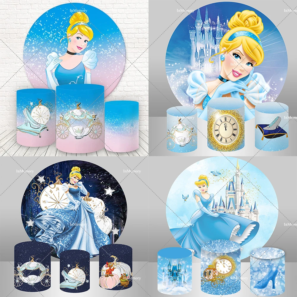 Princess Cinderella Girl Birthday Round Circle Backdrops Cover Blue theme Castle Photo Background Party Decoration Supplies
