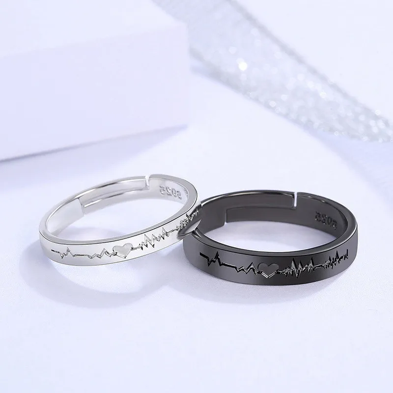 2Pcs/set Romantic Couple Rings For Women Men Punk Heart ECG Black White Forever Love Promise Wedding Ring Valentine'S Day Gift