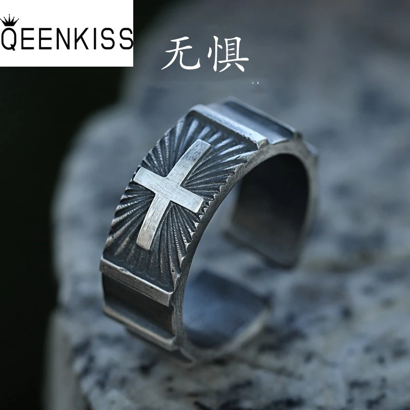 QEENKISS 925 Sterling Silver Cross Ring for Men Vintage Fearless Ring Fine Jewelry Wedding Party Groom Father Boy Gift RG6967