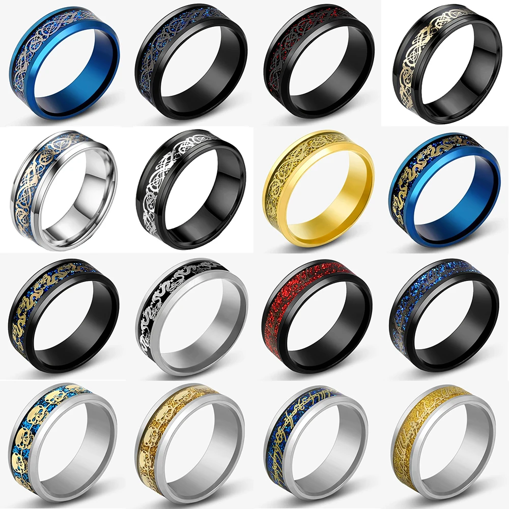 Viking Dragon Stainless Steel Wedding Band Rings For Men Black Tungsten Inlaid Blue Carbon Fibre Rings Jewelry Anillo Hombre