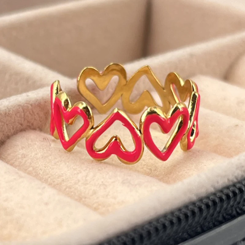 Boho Enamel Color Finger Rings for Women Stainless Steel Ring Hollow Heart Adjustable Open Rings Gold 14K Jewelry Gift for Women