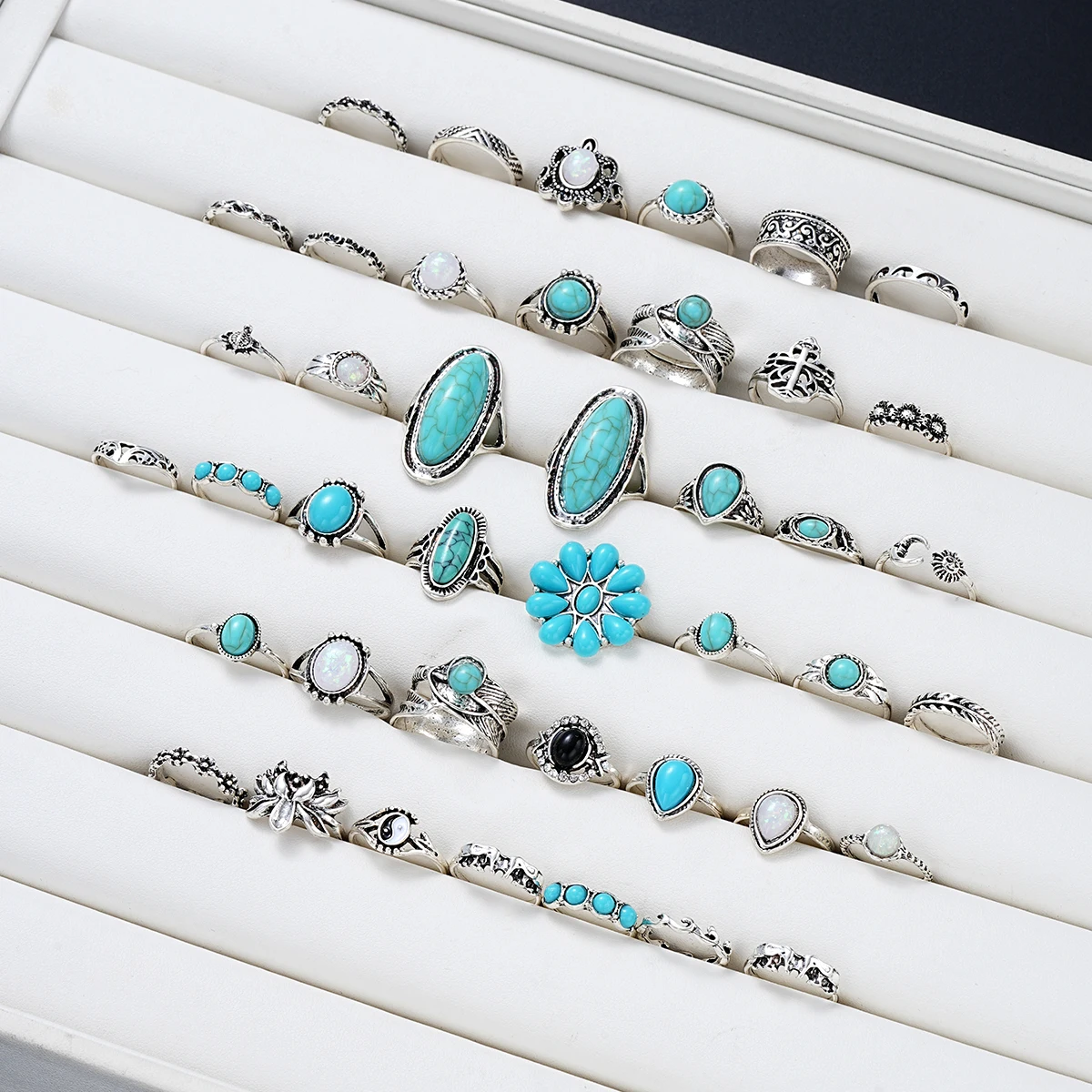 42Pcs/Set Vintage Boho Turquoise Rings Set for Women Ethnic Style Geometric Flower Opening Adjustable Ring Fashion Party Gifts